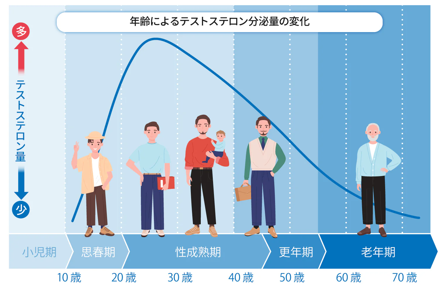 一般的に、年齢が上がるとともにテストステロンの分泌は減少します。また、過度なストレス、不健康な食生活、睡眠不足などが減少の原因とも言われています。