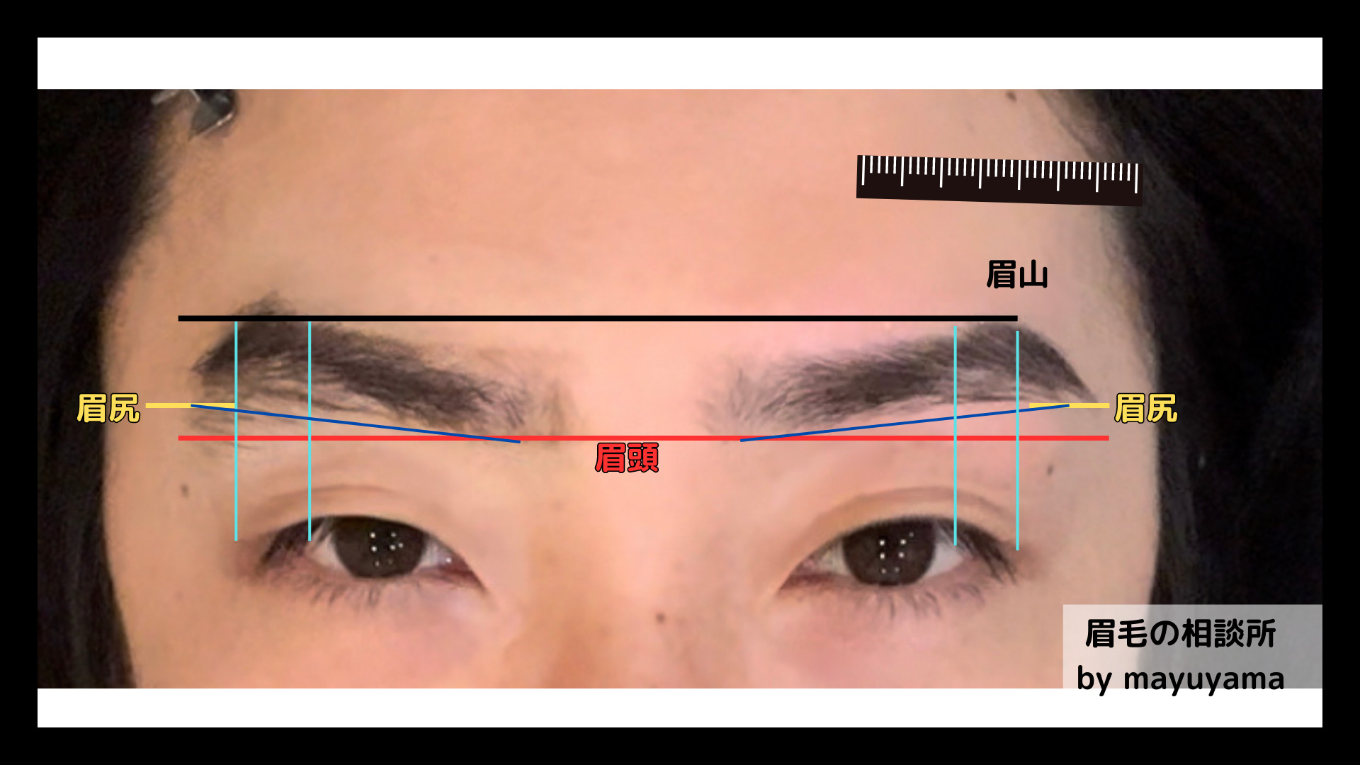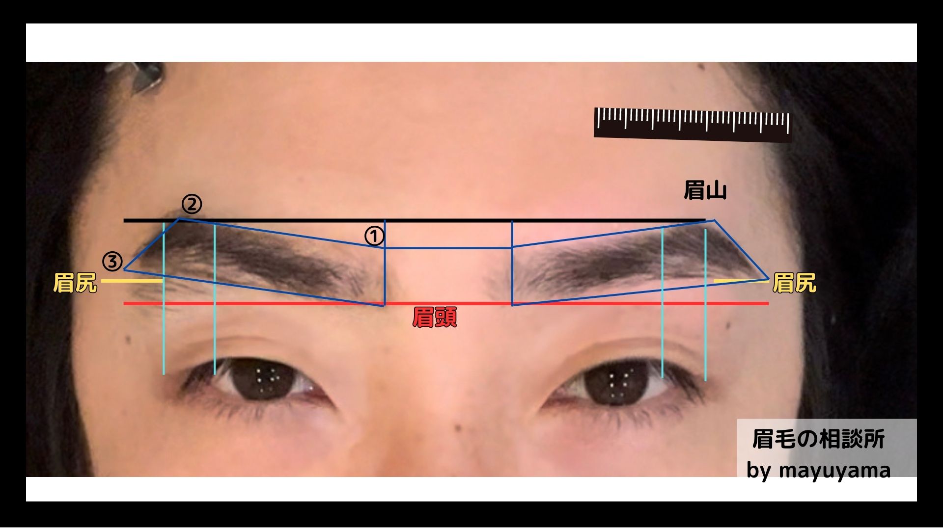 一番大切なのでもう一度お伝えしますが、眉毛の枠を描くことが一番大切です、慣れてくると定規なしでも描くことができるようになりますが。