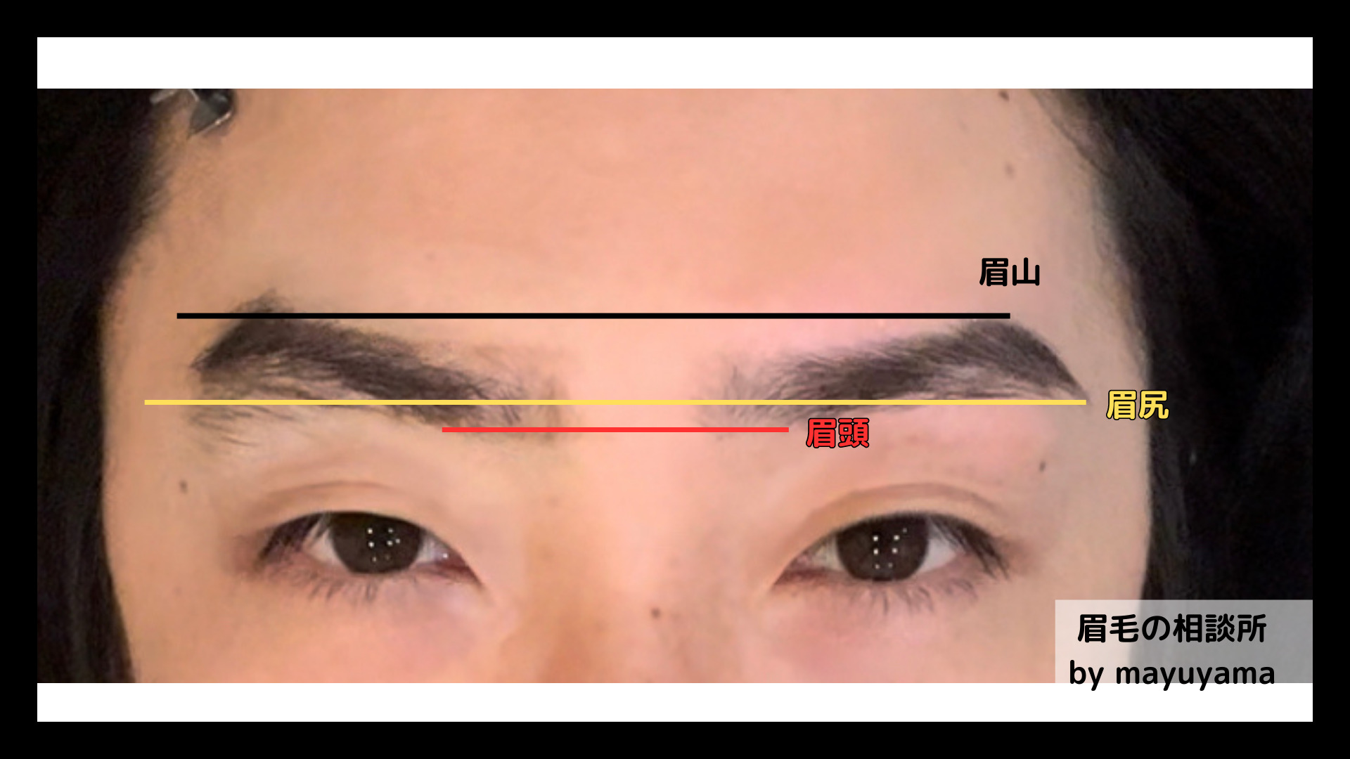- 写真の黒い線のように、左右の眉山の高さを同じ位置になるように直線で繋ぎます。この時に、眉山を超えるぐらい線を引いても大丈夫です。また、眉毛の高さが左右違う方は、自分が綺麗と思う方の眉毛に合わせるようにしてください。